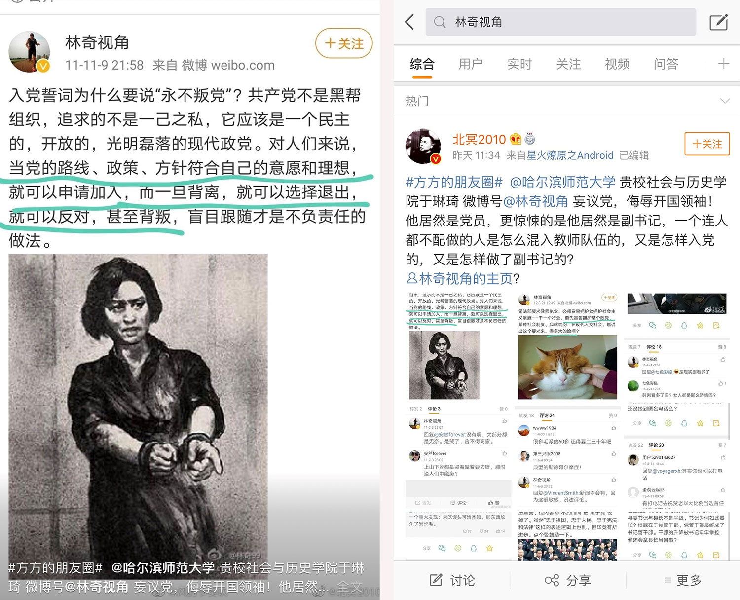 目前,于琳琦的微博@林奇视角文章已经删除。@林奇视角微博截图所见,于琳琦留言写道,入党誓词为什么要说“永不叛党?共产党不是黑帮组织,追求的不是一己之私,它应该是一个民主的,开放的,光明磊落的现代政党。对人们来说, 当党的路线、政策、方针符合自己的意愿和理想, 就可以申请加入,而一旦背离,就可以选择退出,就可以反对,甚至背叛,盲目跟随才是不负责任的做法。还说,世界上最成功的教唆犯是马克思。有微博文字说,于琳琦侮辱英烈刘胡兰,说她的行为在当时角度看属于刑事犯罪。还说雷锋这个榜样祸害了许多人。