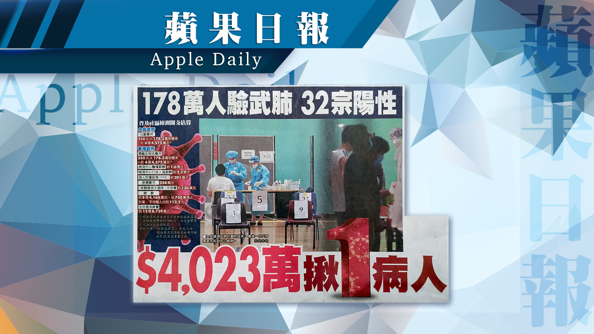 為期14日、由中央及林鄭政府自編自導的全民檢測「大龍鳳」昨落幕,最終僅得178.3萬人參與,遠低於政府目標。本報估算計劃耗資近13億元,惟至今只發現32宗確診個案,即平均花費4,023萬元才揪出一名患者;港府更需承擔近8.3億元的物流及檢測人員等開支,較聲稱全力支持本港抗疫、但最終僅需付4.4億多元化驗費的中央政府多出近一倍,全港750萬港人平均每人無端要付112元為計劃「埋單」。