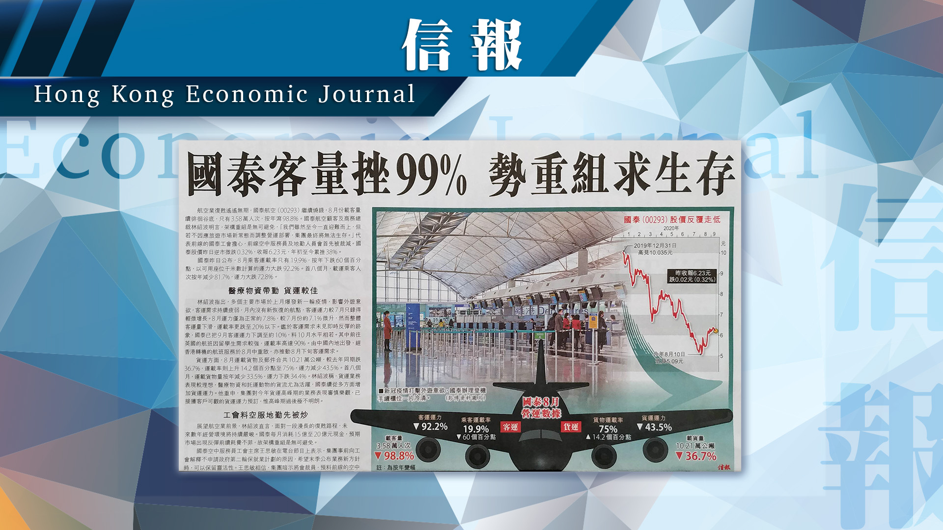 航空業復甦遙遙無期,國泰航空繼續燒錢,8月份載客量續徘徊谷底,只有3.58萬人次,按年瀉98.8%。國泰航空顧客及商務總裁林紹波明言,架構重組是無可避免,「我們雖然至今一直迎難而上,但若不因應旅遊市場新常態而調整營運部署,集團最終將無法生存。」代表前線的國泰工會擔心,前線空中服務員及地勤人員會首先被裁減。國泰股價昨日逆市微跌0.32%,收報6.23元,年初至今累挫38%。