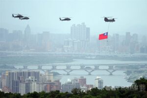 此外,最受矚目的空中展演項目,除陸航CH-47SD運輸直升機吊掛國旗,搭配UH-60M黑鷹直升機編隊,也有雷虎小組為天空畫上藍白紅彩煙,更加入了近年完成升級的F-16V戰機,首次在府前上空編隊衝場。