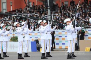 雙十國慶典禮上午8時50分登場,首先由苗栗陳家班北管八音團帶來「八音慶雙十,台灣向前行」民俗技藝演出。