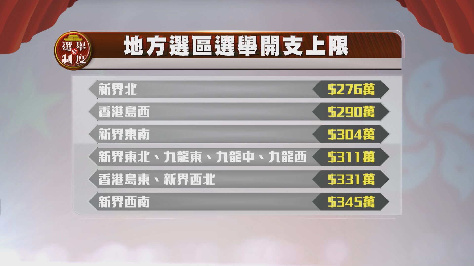 各區會按涉及的區議會選區數目,訂出選舉開支上限,由276萬元至345萬元。