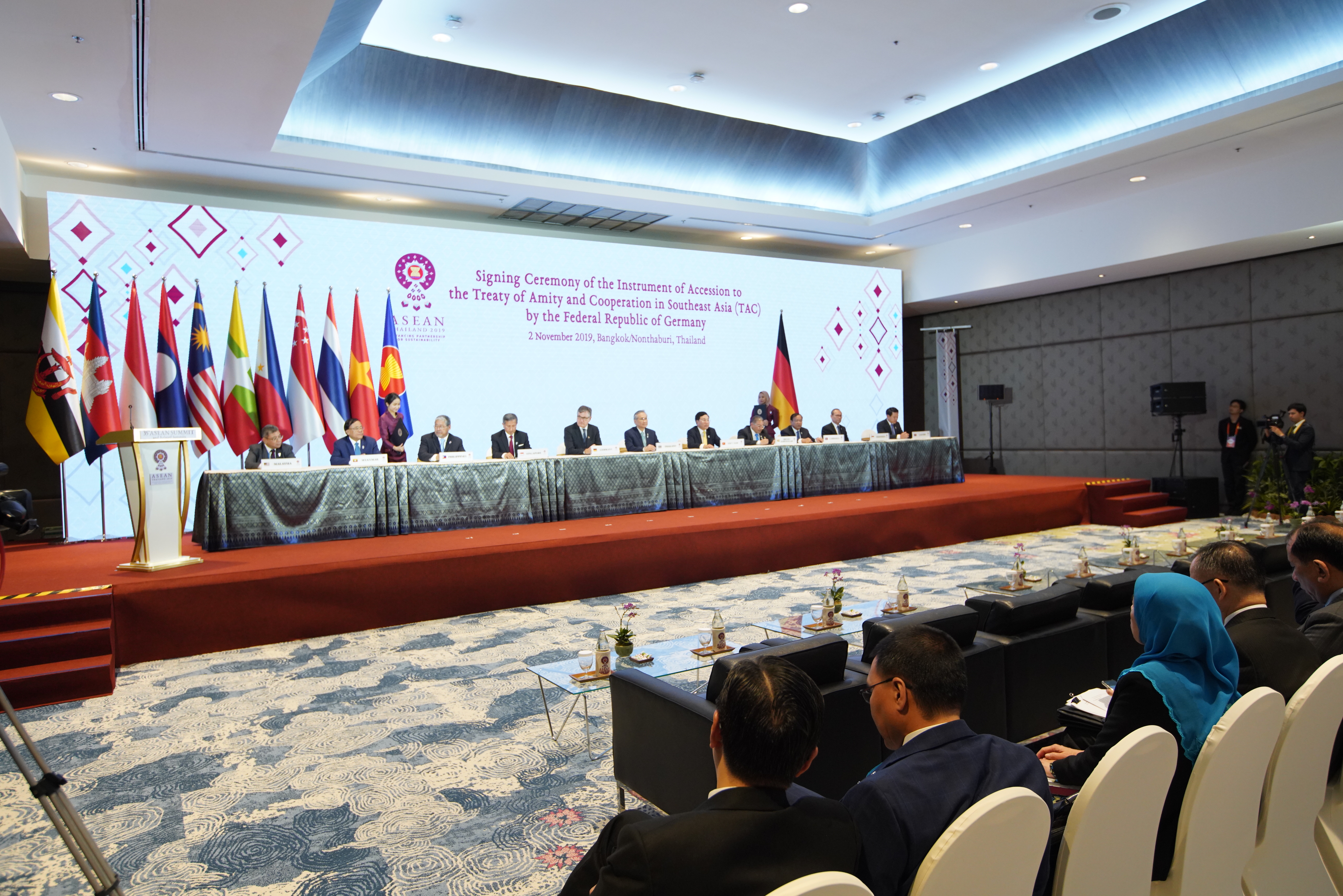 国际 巴林与德国签署《东南亚友好合作条约》(TAC)签署仪式 由 中时 - 2019年11月2日 (中华时报讯)记者晓港曼谷报道:2019年11月2日,巴林王国外交大臣谢赫·哈立德·本·艾哈迈德·本·穆罕默德·哈利法阁下和德意志联邦共和国驻印度尼西亚,东盟和东帝汶特命全权大使彼得·肖夫先生阁下在第35届东盟峰会及相关峰会上签署了《东南亚友好合作条约加入文书》。