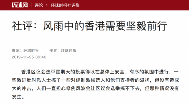 题为〈风雨中的香港需要坚毅前行〉的社评又说,「最近几个月暴力肆虐全港,它作为非理性的政治能量显然会以各种方式转化成对选举进程的直接影响,对很多人、尤其是对建制派候选人以及他们支持者造成压力」。