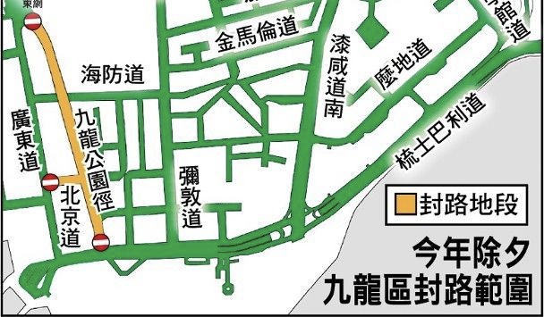 警方除夕港九地區作多項封路安排。警方指,港島區封路和人流管制措施集中在銅鑼灣、中環及灣仔區;至於九龍區方面,據了解,警方會按照今年平安夜的布防格局,僅針對九龍公園徑,以及廣東道至九龍公園徑一帶的北京道進行封路安排,屆時相關的封路區域將會取消行人專用區,讓警方安排警力於該處布防,預防倒數前夕就發生衝突事件。