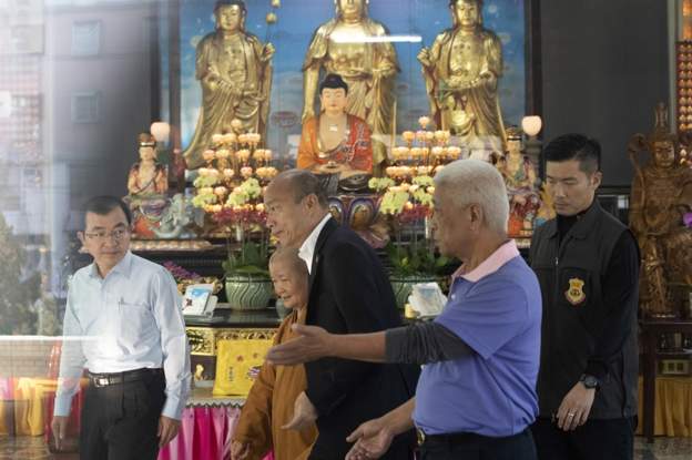 国民党候选人韩国瑜早上约8时前往台湾高雄市云林区一个设在佛寺的投票站完成投票。韩国瑜投票后走进寺内参拜,随后离开。