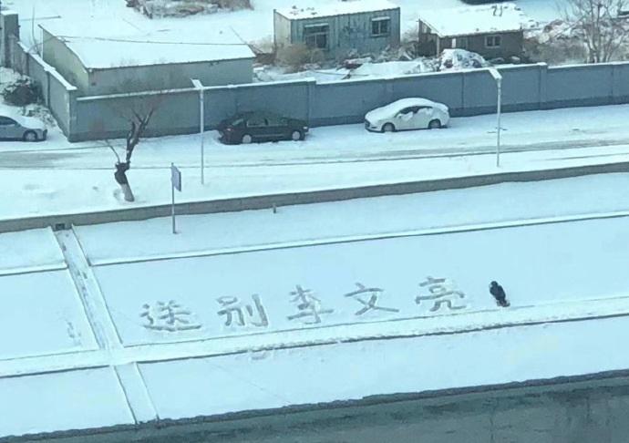 中国北京一位市民看着雪地里出现“送别李文亮”文字。(“威力无穷的威叔”微博)