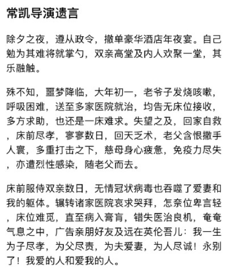 报导引述常凯的大学同学说,常凯在去世前写下遗言讲述求医难,并称他与妻子都感染武汉肺炎,「辗转诸家医院哀求哭拜,怎奈位卑言轻,床位难觅,直至病入膏肓,错失医治良机,奄奄气息之中,广告亲朋好友及远在英伦吾儿:我一生为子尽孝,为父尽责,为夫爱妻,为人尽诚!永别了!我爱的人和爱我的人。」
