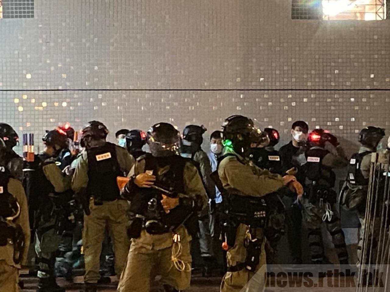 有警员用扬声器表示,所有人必须先被截查盘问,经调查后如发现无特别,会让人离开。有警员驱赶附近记者,指记者无特权。