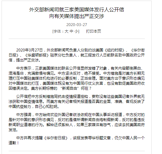 中国外交部新闻司的复信说,“凡事皆有因果。三家发行人在信里说对了一点,那就是中方收回三家媒体美籍驻华记者证件是对美方驱逐60名中国媒体驻美记者的反制行为。”声明并从“2018年12月,美方要求有关中国媒体驻美机构注册为‘外国代理人’”开始为例,列举了此后美方对上述中国官媒的增强管控行为。声明称,“此外,2018年以来,29名中国记者无故被美方拒签,其中9名为常驻记者。所有中方记者只获发一次入境签证,回国休假后常常因美方无故拒签而无法返回美国工作,且中方记者在申请赴美签证时被要求提供很多额外材料。在美方宣布‘驱逐’中方记者并对其不断升级政治打压时,作为‘业界良心’的三大‘主流媒体’有没有替中国同行仗义执言?是否公开批评了美国政府?是否曾敦促美国政府收回错误决定?此时,你们张口闭口标榜的‘新闻自由’呢?面对美方不断升级的政治打压和歧视性做法,难道你们指望中方只作‘沉默的羔羊’?”