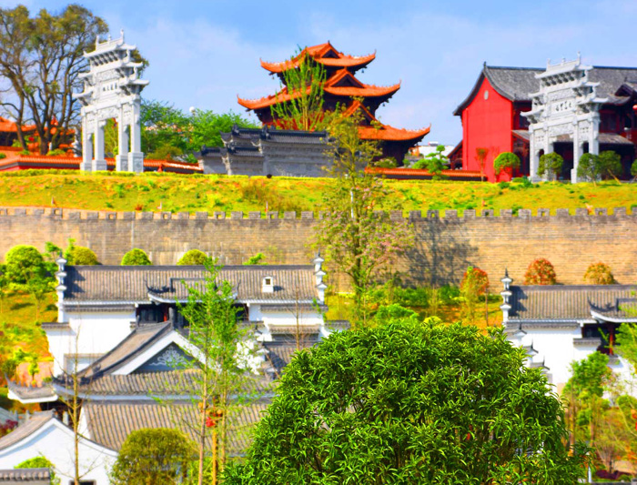 从城墙的垛口向外看,潮音阁掩映在绿树从中,溪水潺潺,碧波一潭,植被茂盛,五颜六色的花草,拥有古老历史传说的平越驿站景观,福泉古城墙文物保护纪念碑,古墙牌坊等古城小景交相辉映,古与今的交融,无不诠释体现着福泉古城其深厚的文化底蕴。