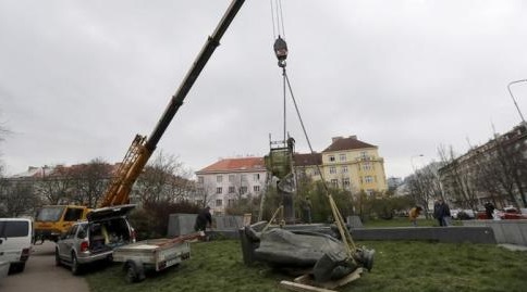 捷克首都一个广场上的前苏军将领伊万-科涅夫元帅的雕像4月3日被吊车拆卸下来,转移到一个即将开张的博物馆里。