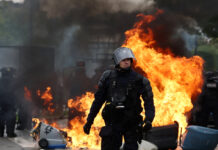 巴黎埃菲爾鐵塔對面特羅卡德羅廣場(又稱人權廣場)上,戴着防護面具的金色雕像。 THO – BENOIT TESSIER