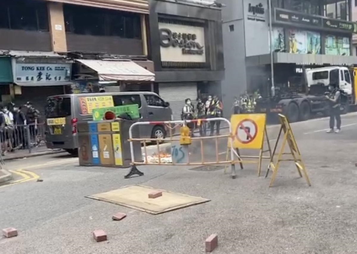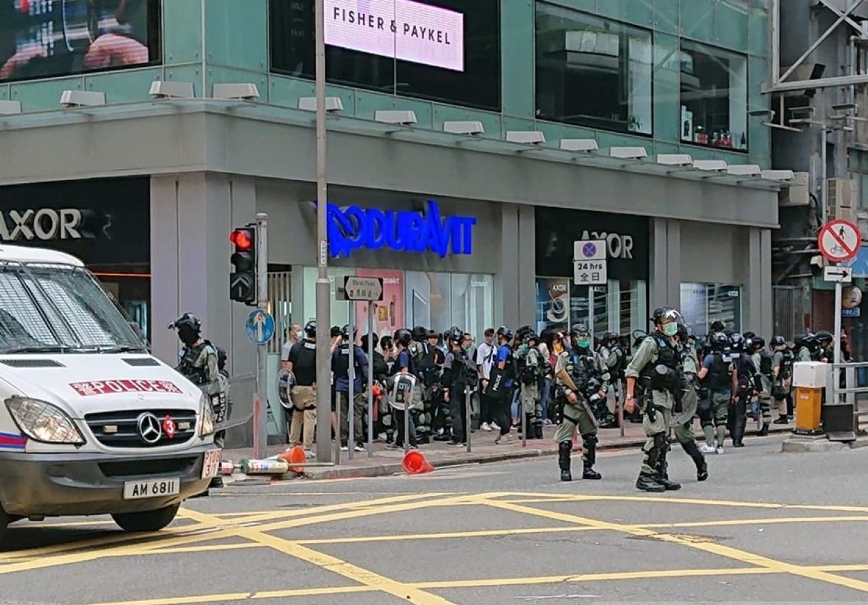 警方在現場多次向在場人士高舉藍旗,警告他們正參與非法集結,之後多名防暴警員在馬路制服一名男子,將他綁上索帶,隨後再舉起黑旗,並施放多枚催淚彈。