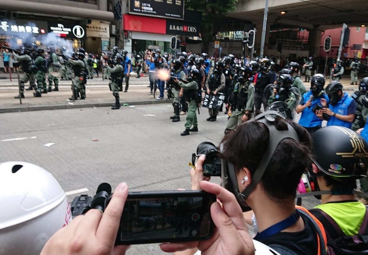 大批防暴警員在鵝頸橋施放多枚催淚彈後,在軒尼詩道戒備,突然被投擲物件。有警員要由同袍以盾牌協助離開,之後有警員向堅拿道西方向發射胡椒球彈。