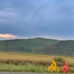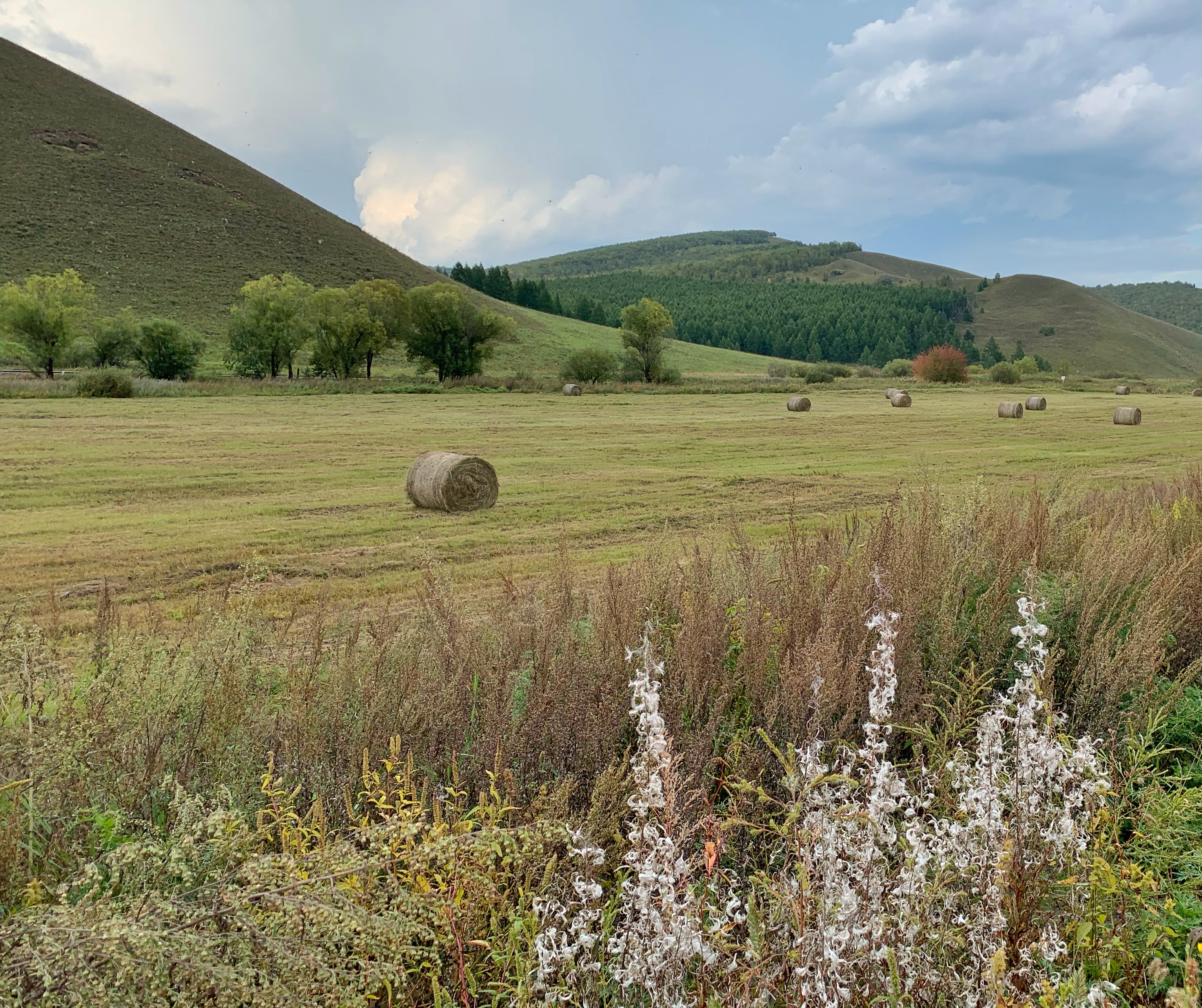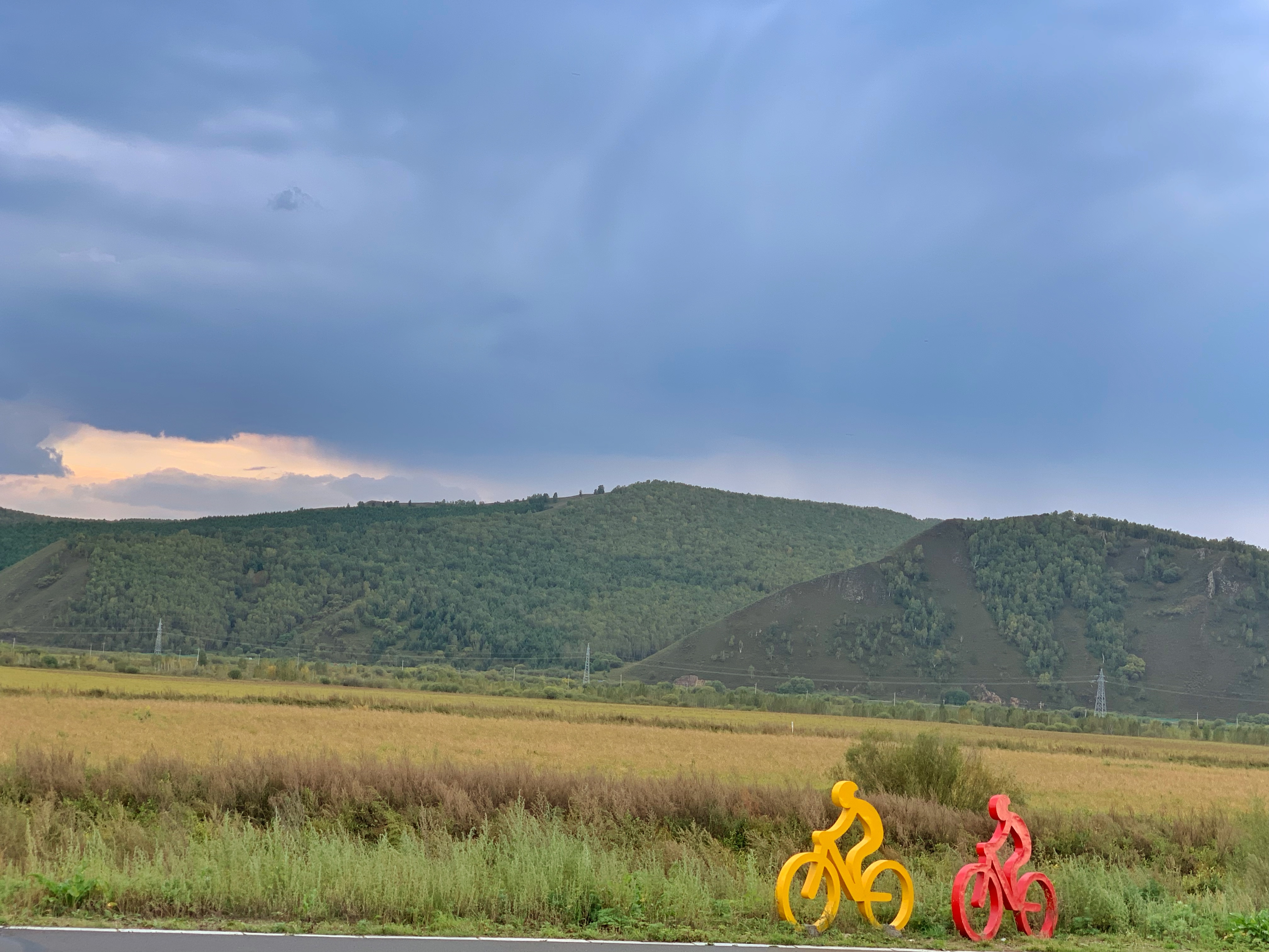 沿途景致秋意浓厚,草原上那一小堆一小堆的,开始不知道是啥,当地的画家陈国生告诉我,这是牧民打下来的干草,留着过冬用的。