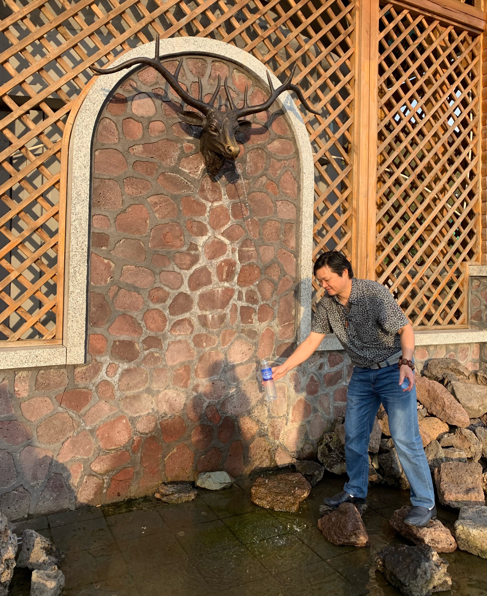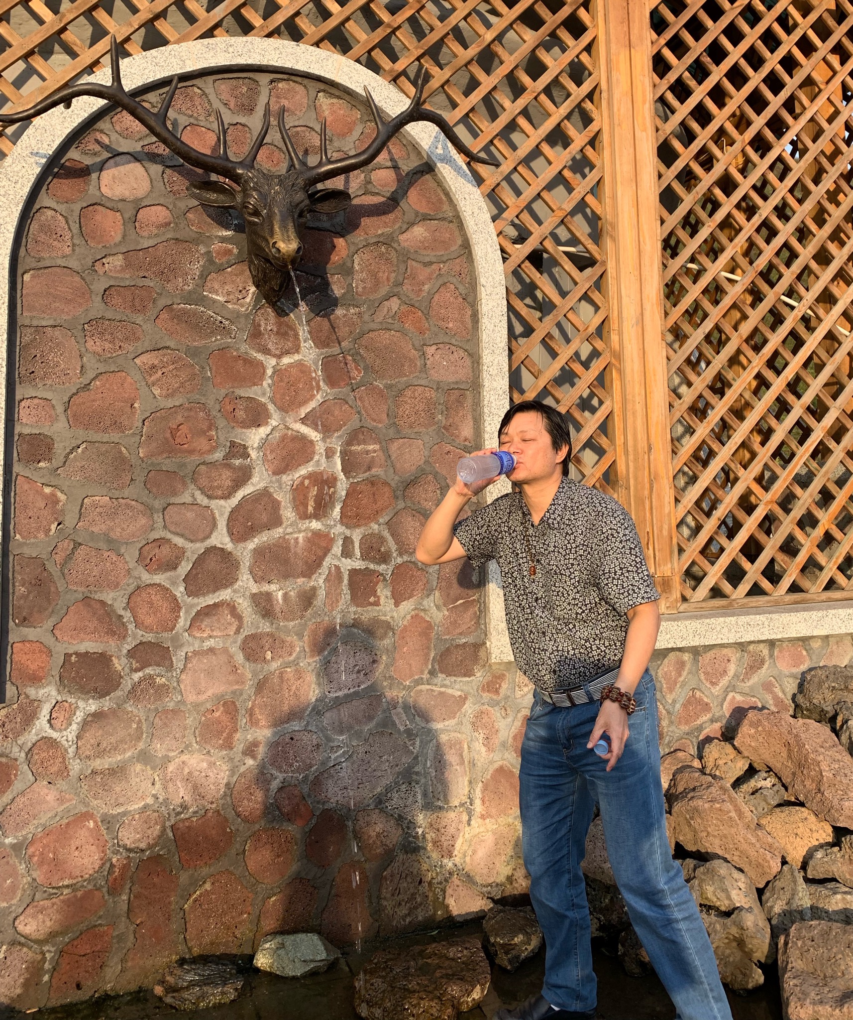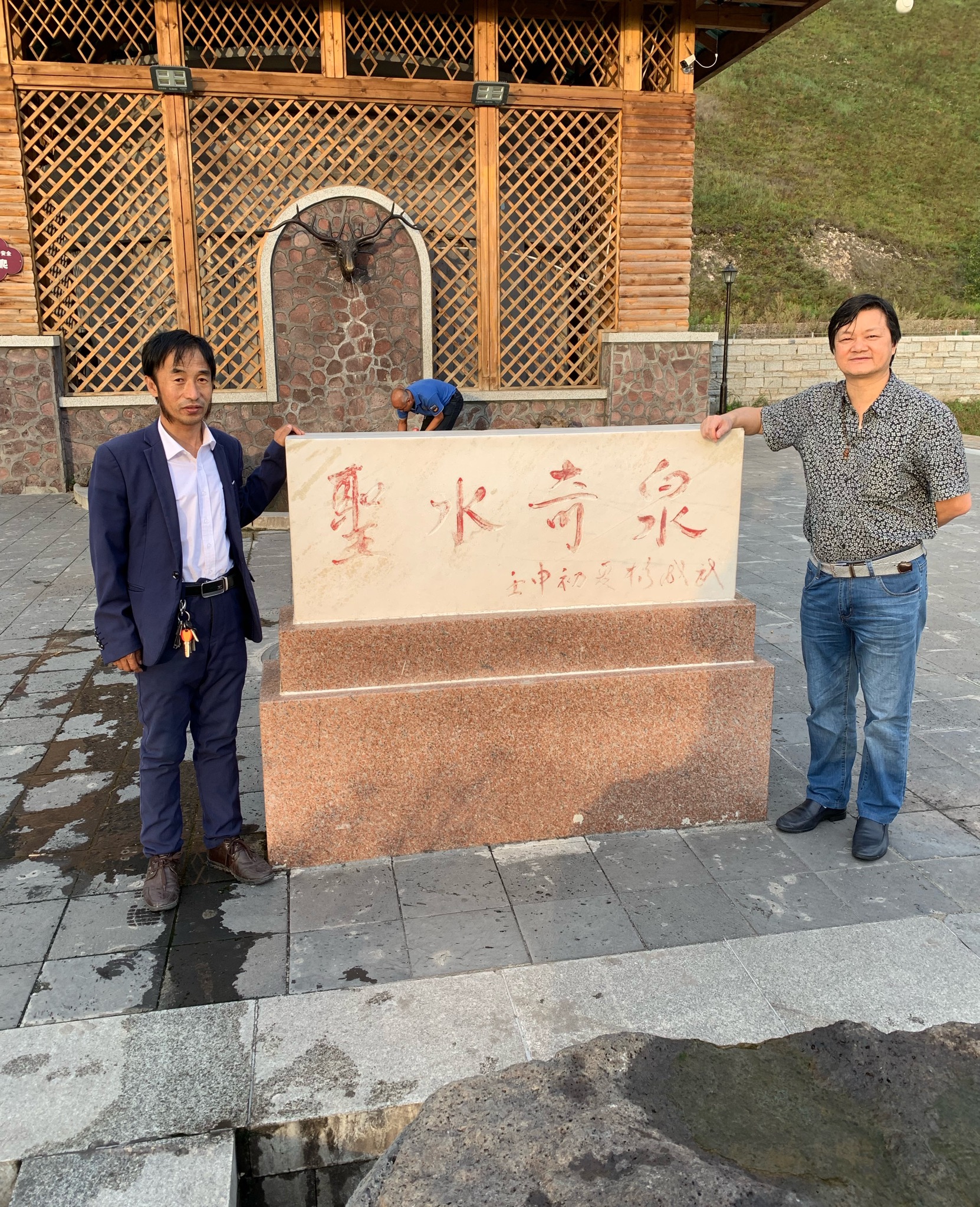 我们驱车到了圣泉,已经傍晚,霞光映照着我们,从旁边购买一个水瓶,排队到了一个鹿头嘴流出的水,一嘀嘀地装进瓶子里,自己喝上了圣泉喝上了颂歌了好多朝代传说的圣水,返车时,把一瓶满满圣水带给在车上没有下车的朋友,让他喝上,让他挥去舟车劳累。