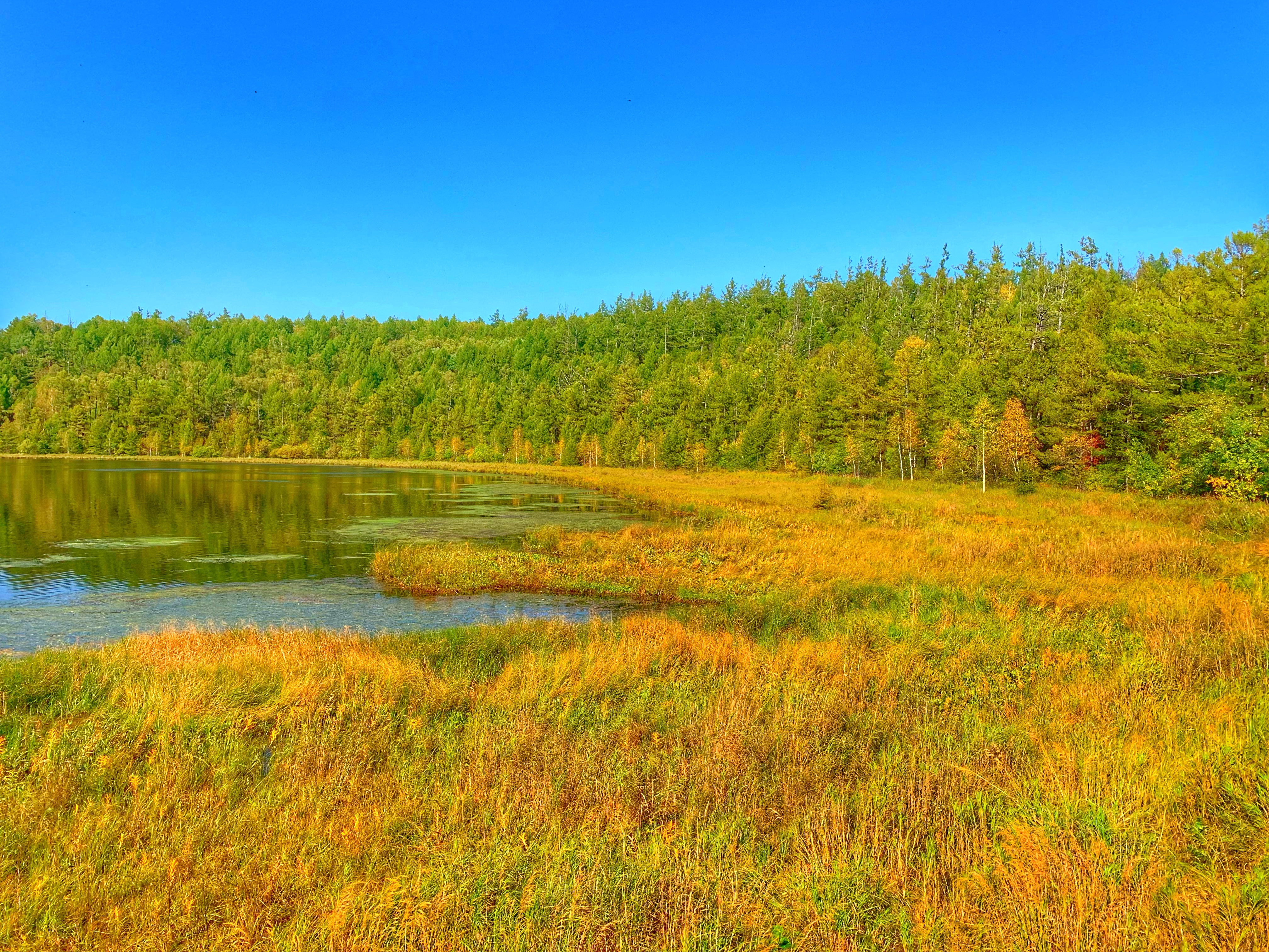 那是深秋的阿尔山四处静谧,湖水静静地在哪里,只有微风吹过,吹皱一汪碧池、吹乱这一拢拢草。