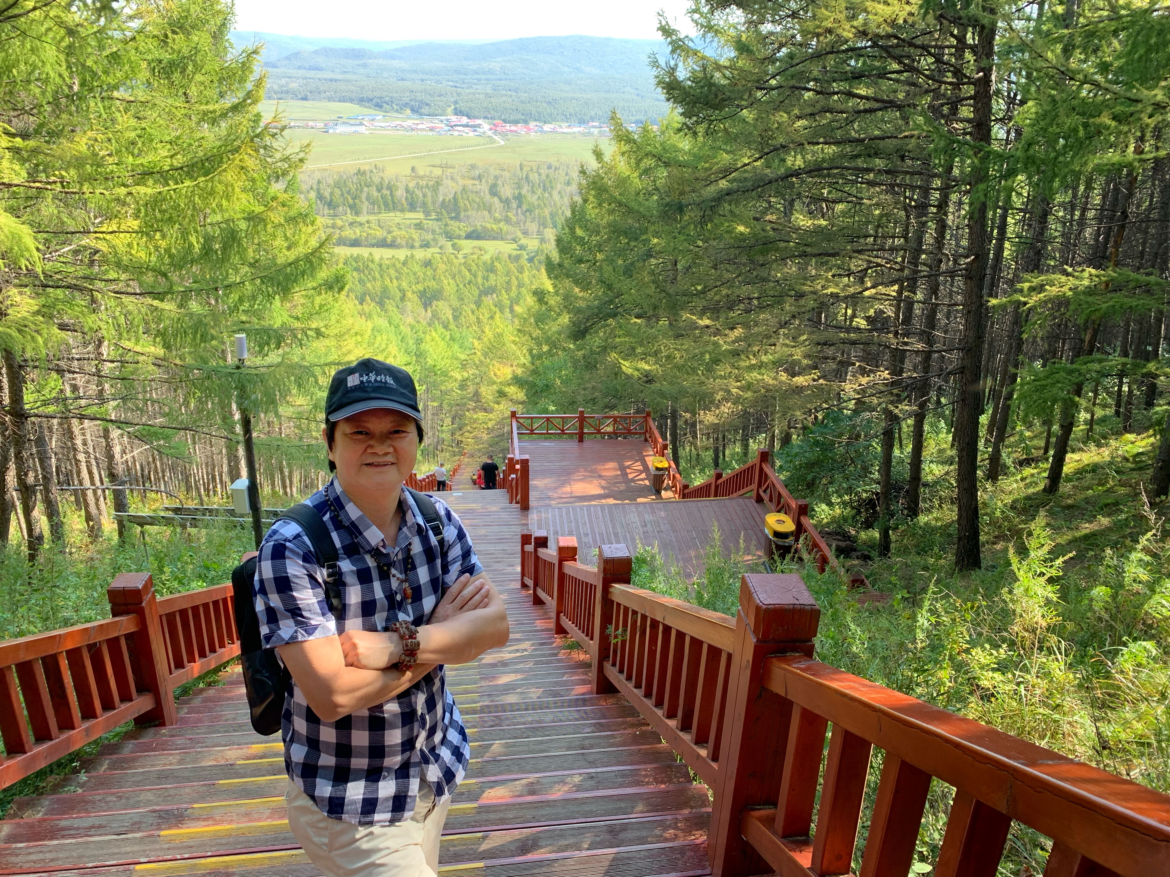 坐着大巴,第一站我们到天池,其实还要爬山去才能看到阿尔山天池的真容,通往天池的公园台阶路上标注:上山998级台阶,下山768级台阶,随行甘肃省围棋协会秘书长蒋先生,爬了到三分之一就爬不动了,他找来抬轿工把他抬上山去了……