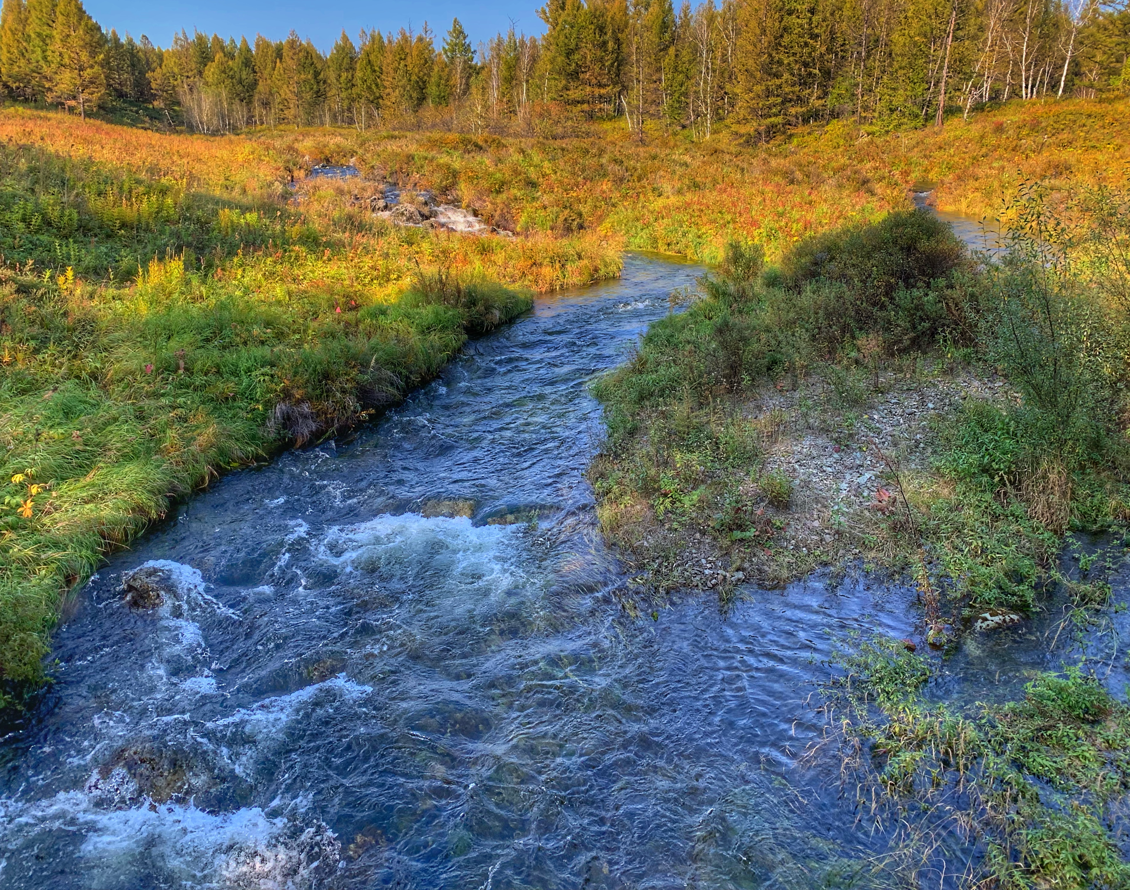 我们也顺便去了石塘林,这里落叶松枝繁叶茂,高山柏遍地延伸,金星梅一片金黄,石与林相依,清流时隐时现,处处景色盎然。