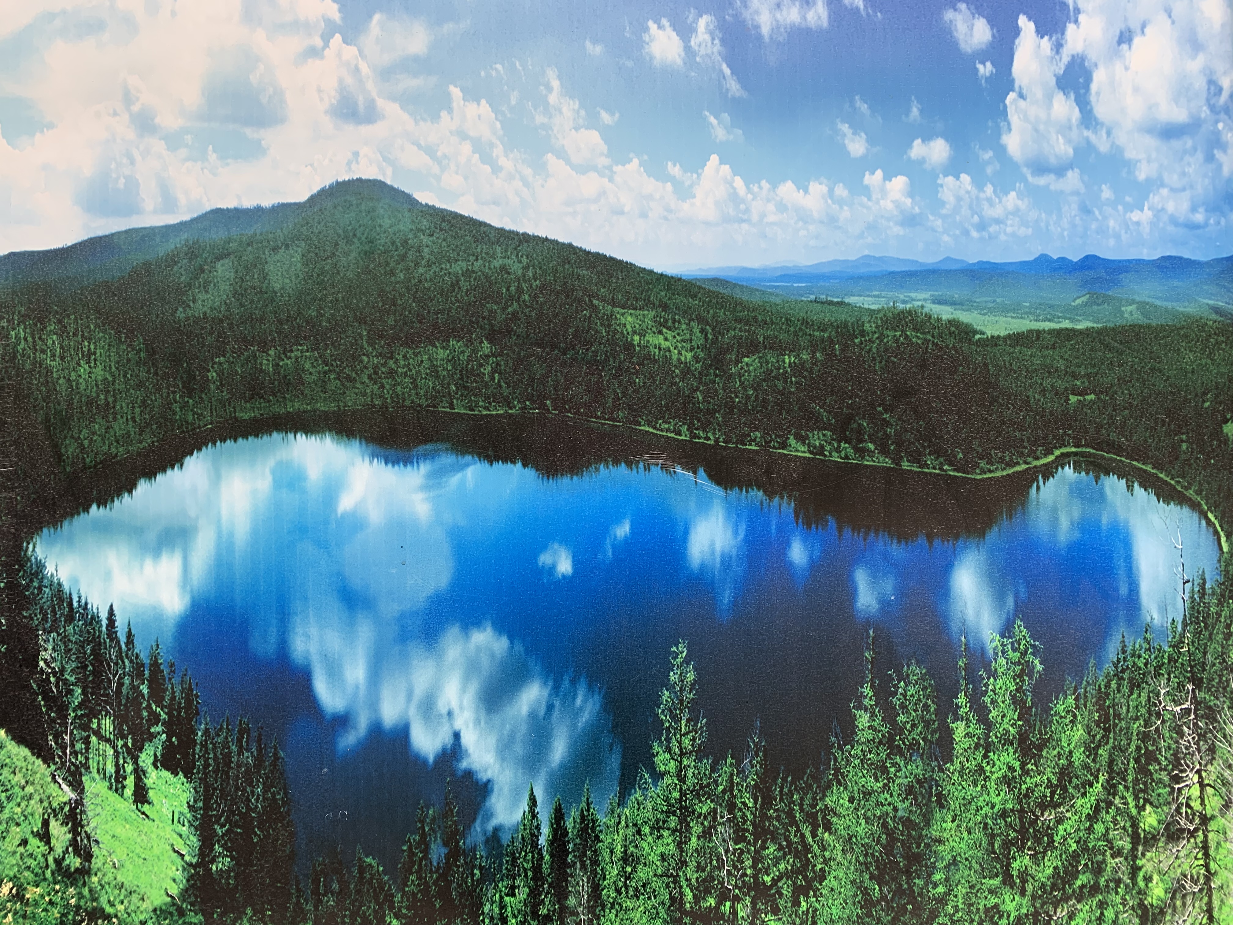 在飞机上,俯瞰着阿尔山,阿尔山的天池如同为大山佩饰的一枚心形玉坠,地池如同为森林磨制的一块玲珑圆镜,驼峰岭天池如同历史留下的一个深深脚印,双沟山天池如同远古遗留下的一颗青橄榄,柴河源天池如同为爱人暗送的一个柔情眼波,银池如同给未来留下的一块绿宝石,月亮池如同嫦娥沐浴的瑶池。