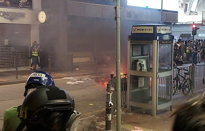 旺角晚上再有人聚集,有人一度在山東街設置路障,水炮車及裝甲車在彌敦道戒備,有警員手持胡椒球槍指向人群警告,有人在奶路臣街及花園街交界焚燒雜物,警員嘗試用水樽淋水及拉走燃燒中的膠桶。