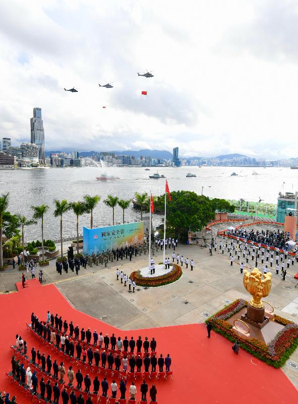 在升旗儀式期間,警察銀樂隊奏樂,並由兩名歌唱家領唱國歌,國旗和區旗早上8時升上旗桿頂,政府飛行服務隊直升機在維港上空飛過,展示大型國旗和區旗,水警輪亦在維港海面噴灑水柱敬禮。