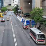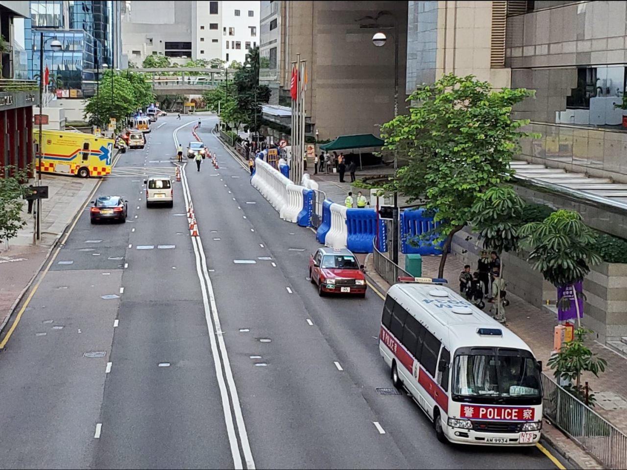 會展一帶兩日前已經提早封路,只准持許可證車輛進入,部分巴士路線亦要改道,巨型水馬陣將會展一帶包圍,並有警員在多個位置駐守,在灣仔駱克道早上有防暴警員搜查幾名年輕人。