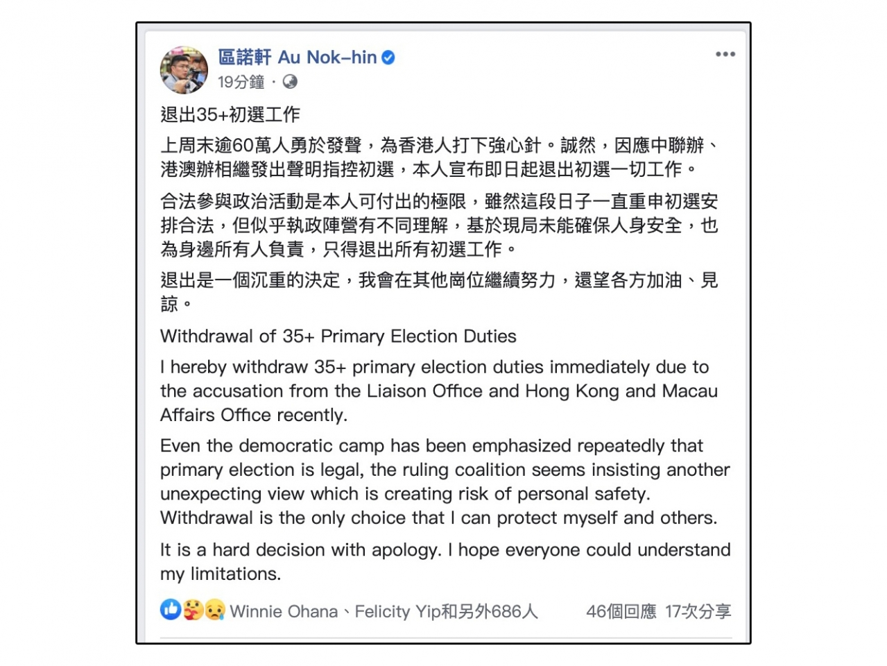 专题港澳港版國安法香港 區諾軒稱因應兩辦聲明 退出初選一切工作 由 中華時報總編室 - 2020年7月15日 有份協調民主派立法會初選的立法會前議員區諾軒宣布,因應中聯辦、港澳辦相繼發出聲明指控初選,即日起退出初選一切工作。區諾軒在社交網站說,合法參與政治活動是他可付出的極限,雖然近日一直重申初選安排合法,但似乎執政陣營有不同理解,基於現時局勢未能確保人身安全,也為身邊所有人負責,只得退出所有初選工作。他又說,退出是一個沉重的決定,會在其他崗位繼續努力。港澳辦及中聯辦日前先後就民主派初選發聲明,指絕不允許操控立法會選舉,形容所謂初選,公然挑戰《基本法》及《港區國安法》。