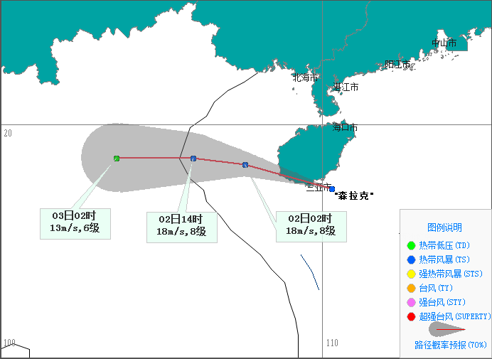 兩岸国际大陆 森拉克移近海南 局部地區降暴雨到大暴雨 由 中时 - 2020年8月1日 熱帶低氣壓森拉克移近海南,當地發出颱風三級預警。 在下午4時,森拉克中心位於三亞市偏西約20公里的海面,預計至明天,海南島西南和東部地區有大雨,局部暴雨到大暴雨,預料森拉克將以每小時25公里左右的速度,向西偏北方向移動,在海南島南部沿海地區擦過,之後進入北部灣海面,維持強度。 瓊州海峽已全線停航,旅客列車停運,進入三亞鳳凰國際機場的航班正常,但離開航班受影響。