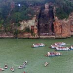 乐山大佛是中国西南部非常受欢迎的景点,它濒临三条河流的交汇处。