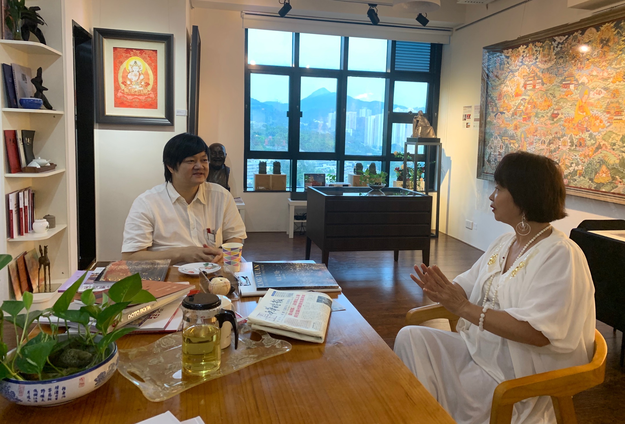 曾曉輝除欣賞了此次展出的藏淵油畫作品外,還參觀了香港天趣當代藝術館長期展出的來自青藏高原的唐卡藝術,唐卡,也叫唐嘎、唐喀,指用彩緞裝裱後懸掛供奉的宗教捲軸畫,以其珍稀昂貴的顏料、惟妙惟肖的畫工、秘不外傳的技藝被譽為「解讀藏族文化密碼的藝術瑰寶」,逐漸被藝術愛好者認知和收藏。