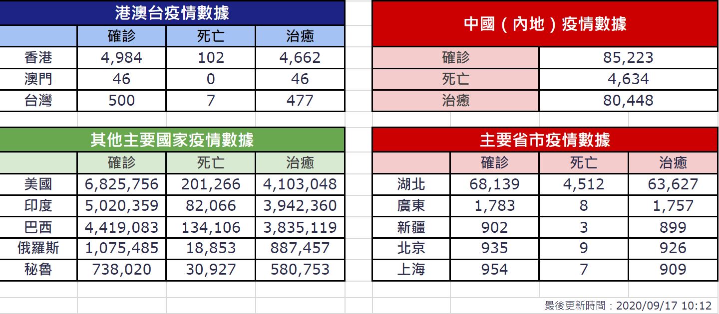 根據美國約翰霍普金斯大學(Johns Hopkins University)統計,截至香港17日上午10時,全球至少93萬7335人死於新冠肺炎,至少2968萬9922人確診。