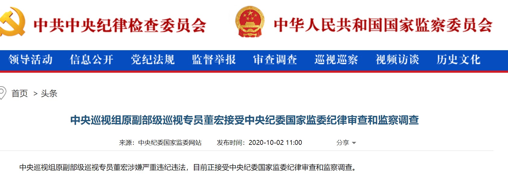 中共中央纪委国家检查委网站10月2日宣布:中央巡视组原副部级巡视专员董宏,涉嫌严重违纪违法,目前正接受中纪委国家监委纪律审查和监察调查。这条只有一句话的消息,没有透露指控内容。