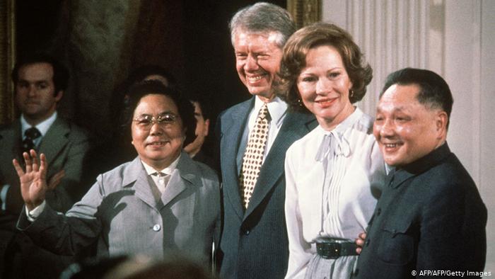 “一国两制” 同样在1979年1月1日,美国与中华人民共和国建交(图为时任美国总统卡特访华),与中华民国断交,同时通过《台湾关系法》。在该背景下,当时已经掌握中共实权的邓小平提出“一国两制”的构想。该政策被用在解决香港和澳门回归问题上。