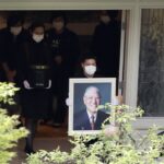 李登輝移靈車隊今天上午自翠山莊出發,李登輝的孫女李坤儀身著黑衣手捧骨灰罈、李坤儀夫婿趙贊凱手捧李登輝遺照,李登輝女兒李安妮等家屬也隨行送別李登輝最後一程。