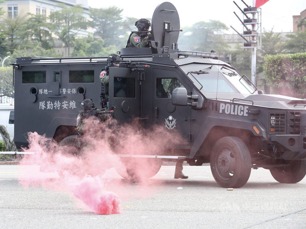 國慶典禮今天舉行,序幕暖場階段,由三軍樂儀隊、憲兵快反連、維安特勤隊及空勤總隊黑鷹演出及演練,俗稱「紅鷹」的空勤UH-60M黑鷹直升機,首次以低高度飛進總統府限航區。