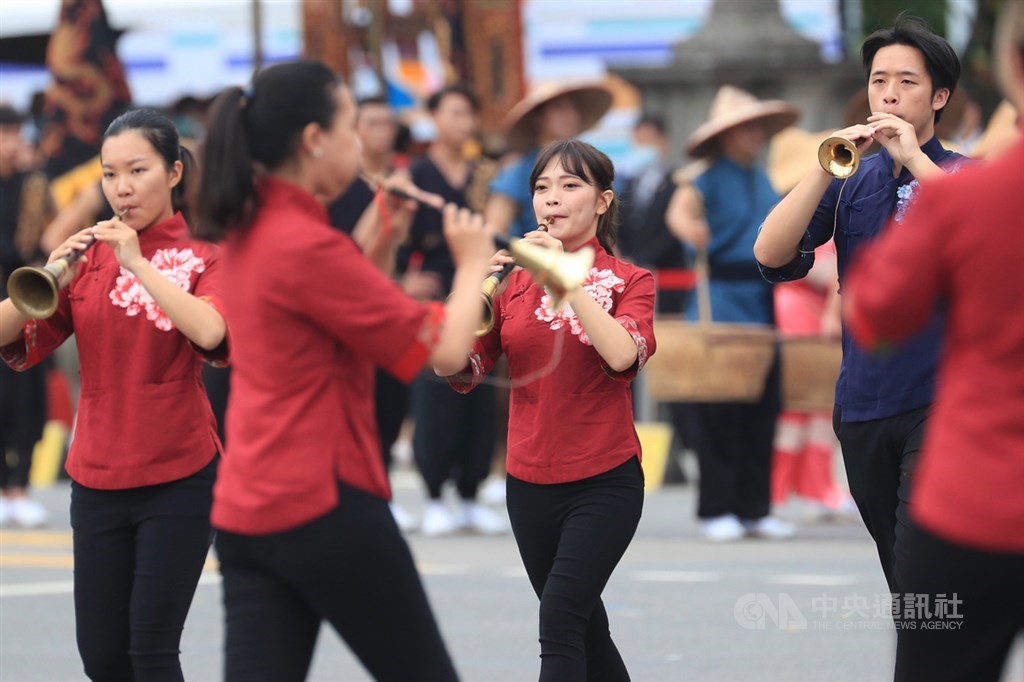 雙十國慶典禮上午8時50分登場,首先由苗栗陳家班北管八音團帶來「八音慶雙十,台灣向前行」民俗技藝演出。