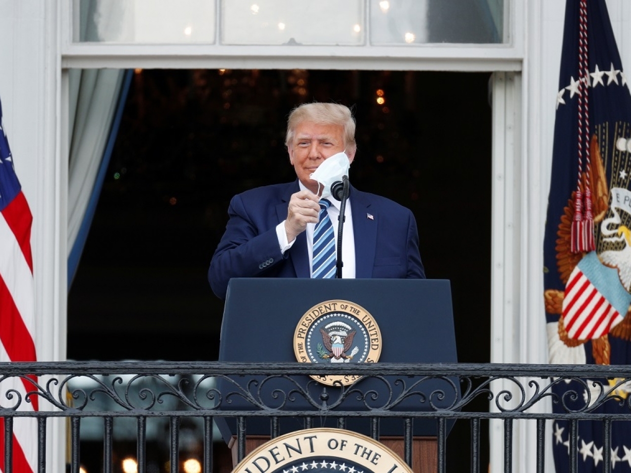 特朗普总统星期六(10月10日)在白宫阳台上向在南草坪参加“为了法律与秩序而和平抗议”活动的数百名支持者发表了18分钟的讲话。这是他星期一出院后首次公开露面。他走出阳台时戴着口罩,并在讲话时摘掉了口罩,引发支持着热情的回应。几百人获邀在南草坪出席。大多数人有戴口罩,但没有怎样保持社交距离。