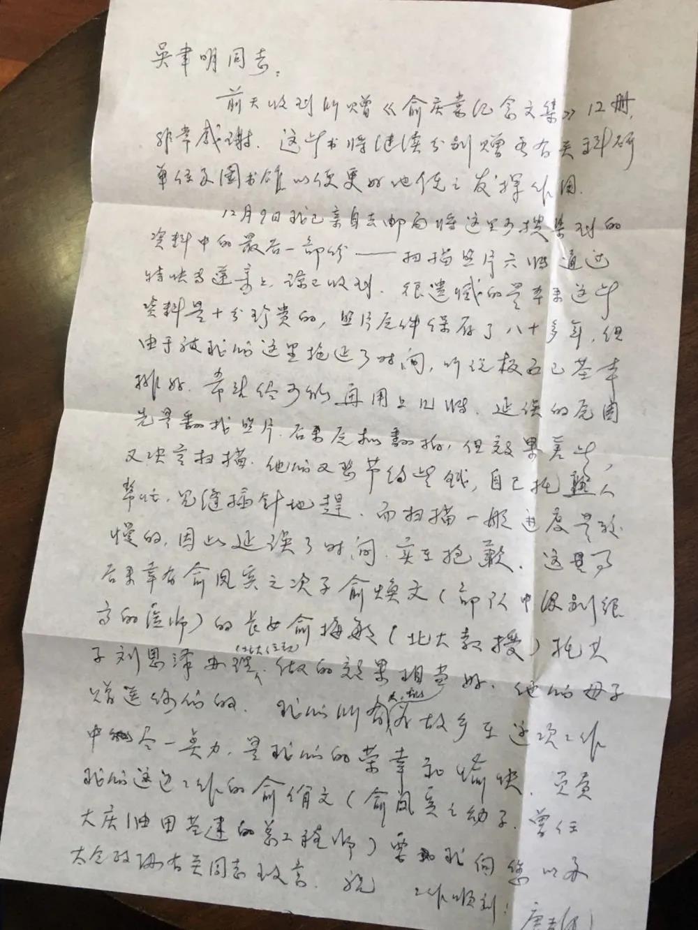 1999年12月12日,唐孝纯致吴聿明的信,其中提到“俞凤宾的幼子俞佾文(国家建工局重大项目基建专家总工程师)”。(注:俞凤宾、俞颂华、俞庆棠三兄妹,唐孝纯是俞庆棠的长女,我是俞颂华的长孙,俞庆棠是我的姑奶奶。)