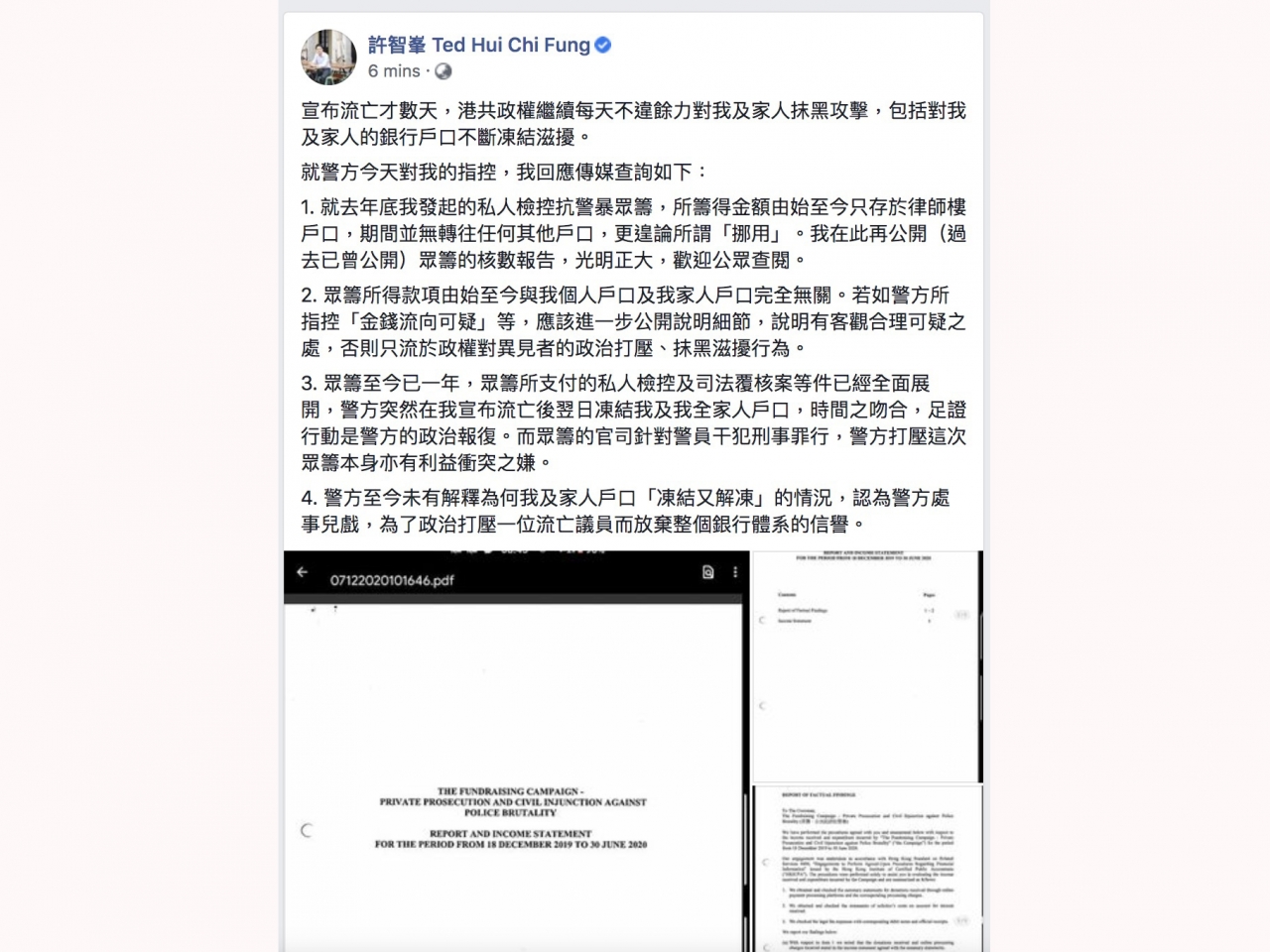 宣布流亡的許智峯在社交網站發文,回應早前指他父母的滙豐戶口服務從未受影響的說法。他說早前自己和家人帳戶被凍結時,戶口可用結餘顯示為零,透過網上理財及親身到當地的滙豐櫃員機,戶口都不能運作。