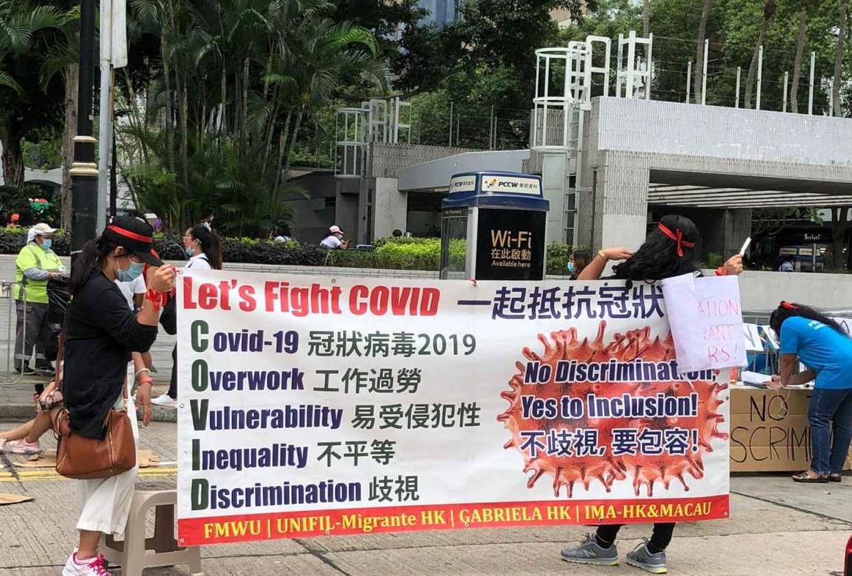 政府要求全港外籍家庭傭工,於本月9日或之前接受強制檢測。在中環遮打道設立的流動檢測站,下午仍有幾百名外傭排隊等候做檢測。有外傭在附近舉起「不歧視,要包容」、「停止對外國家庭僱工的侮辱和選擇性執法」的橫額,抗議政府要求外傭強制檢測,和申請續約時要接種疫苗的安排。