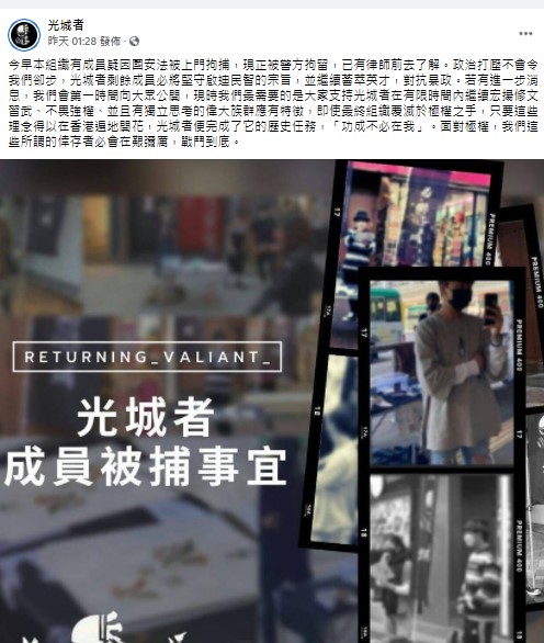 「光城者」臉書專頁也證實這項消息,並強調:「政治打壓不會令我們卻步,光城者剩餘成員必將堅守啟迪民智的宗旨,並繼續薈萃英才,對抗暴政。」