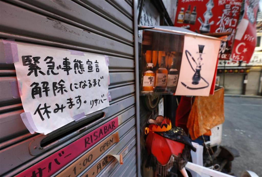 日本9都道府縣因疫情實施「緊急事態宣言」延長到6月20日。圖為東京新宿店家鐵門上貼著因緊急事態宣言而暫停營業的紙張。(共同社)