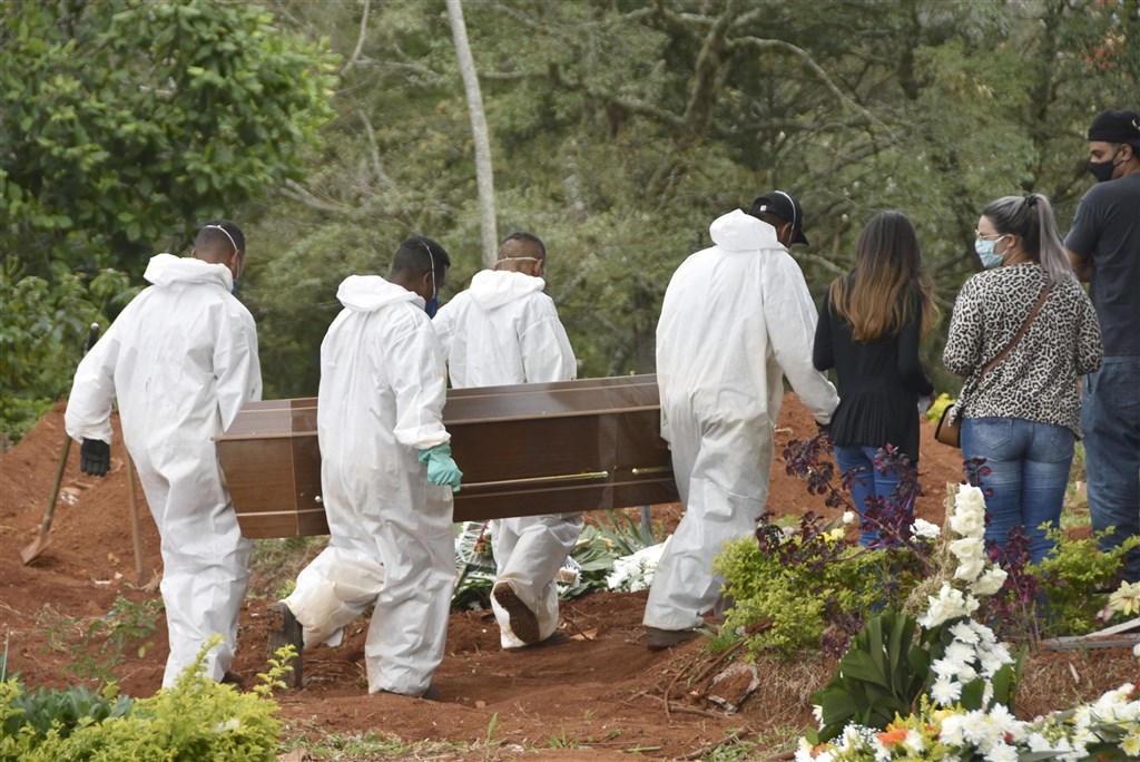 巴西衛生部17日通報,過去24小時新增868人確診感染COVID-19不治,累計病故增至54萬1266例。圖為4月13日巴西墓地人員著防護衣協助埋葬染疫過世的患者。(共同社)