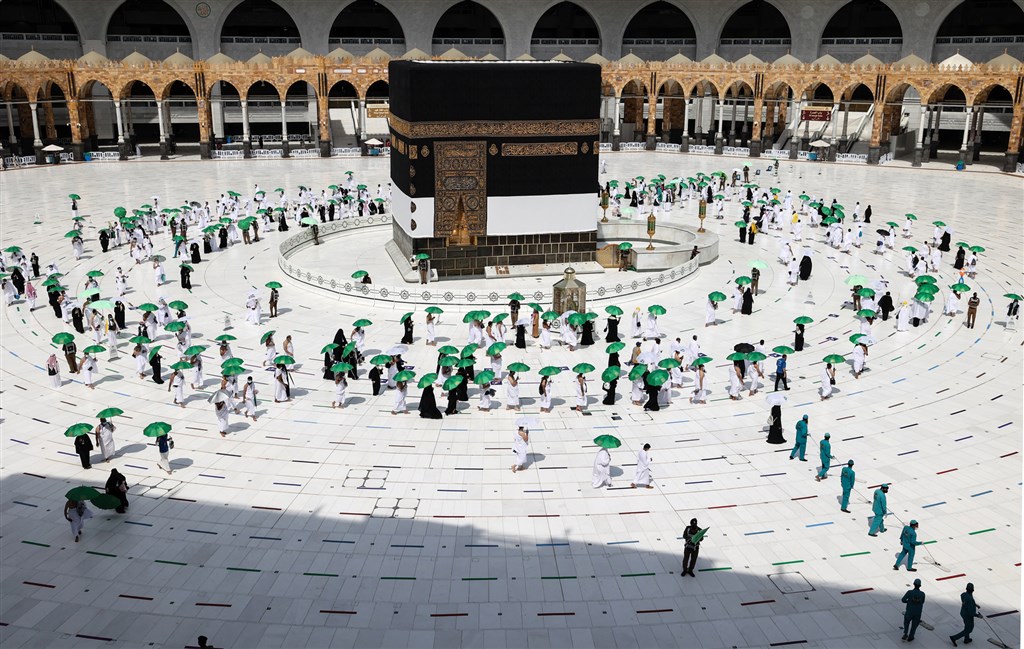 朝聖者17日抵達沙烏地阿拉伯聖城麥加疫情爆發以來第2次朝覲活動,許多人撐著陽傘防暑。(法新社)