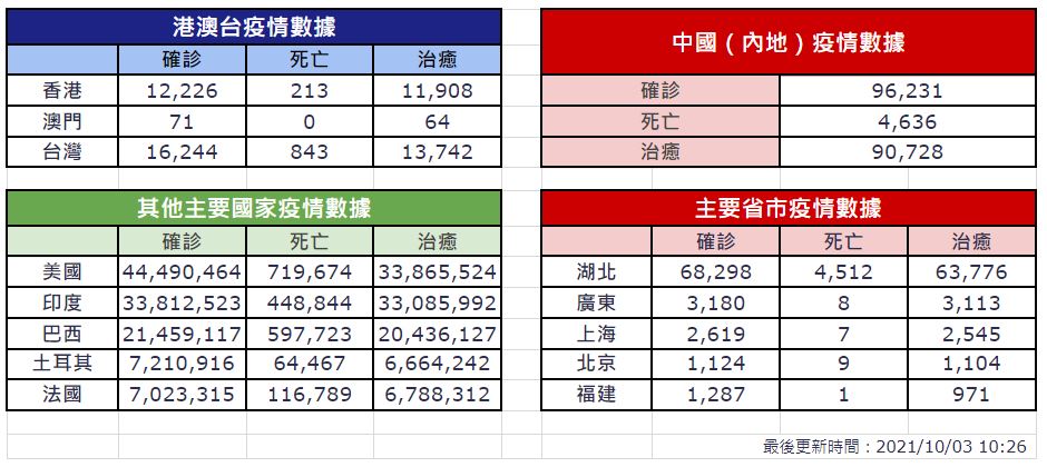 (中華時報/華聞社香港10月4日綜合報導)美國約翰霍普金斯大學(Johns Hopkins University)網站追蹤數據顯示,截至香港4日上午7時,全球至少480萬1053人病逝於COVID-19,至少2億3488萬5333人確診。