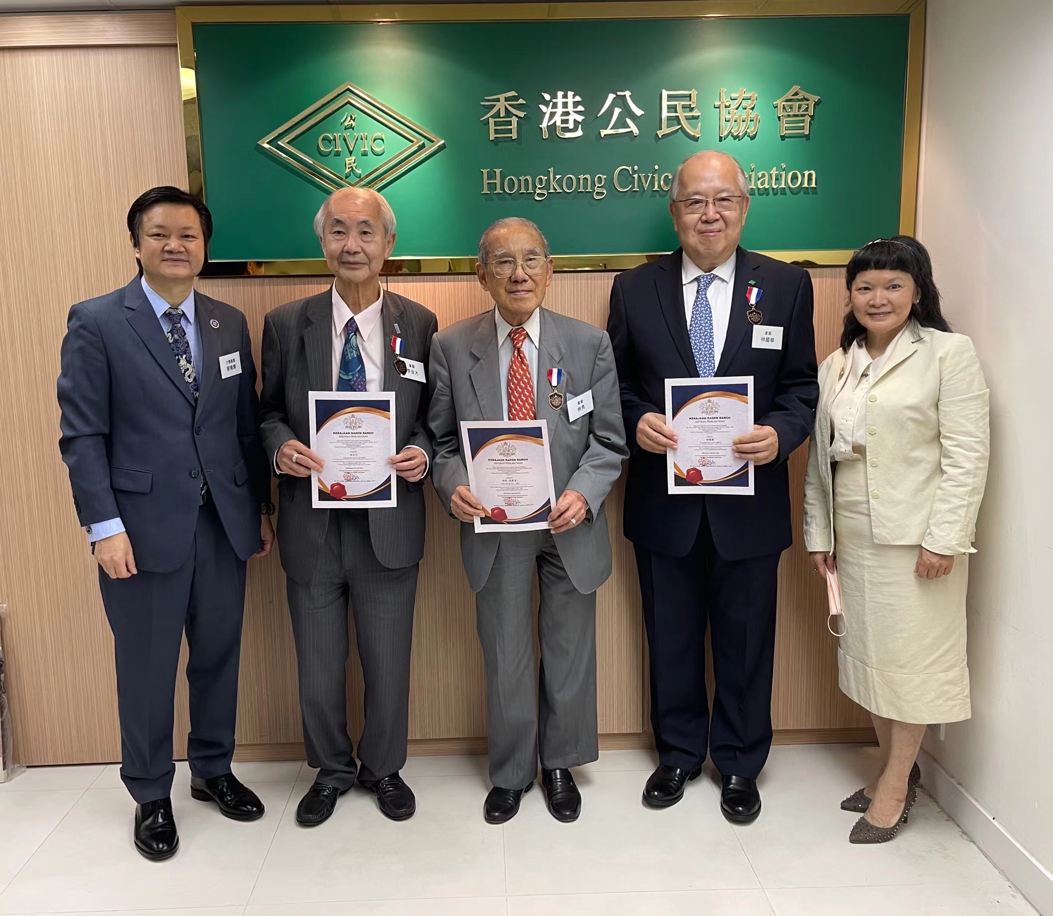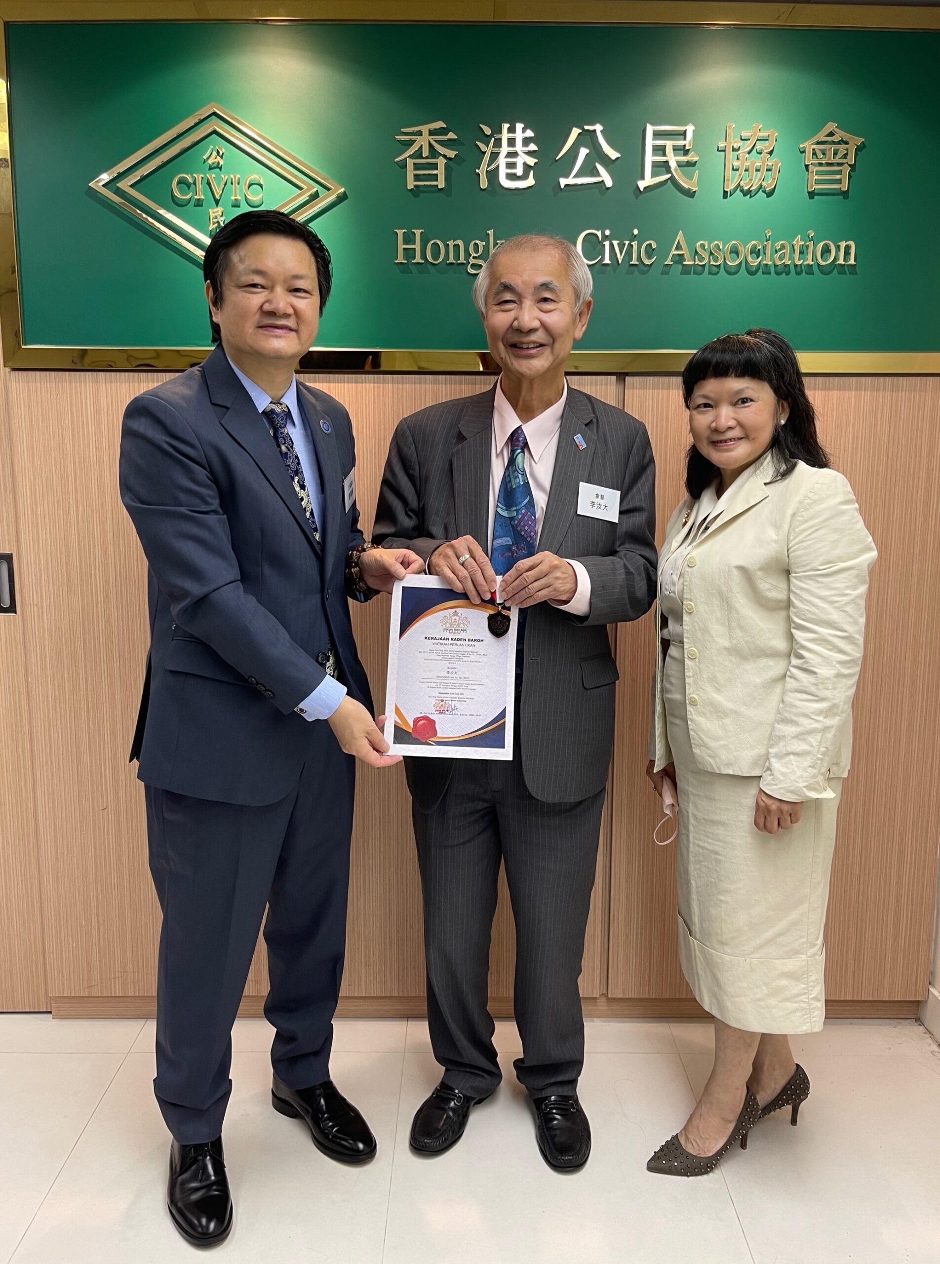 在典禮上,相關委任状和勳章由主禮嘉賓中華時報傳媒集團主席曾曉輝博士和 【印尼婆羅洲東加里曼丹 (㻝登巴鑼)皇室】駐中港澳代表拿督盧彦希女士Dato’ Alice D.P.M.R. 颁授。
