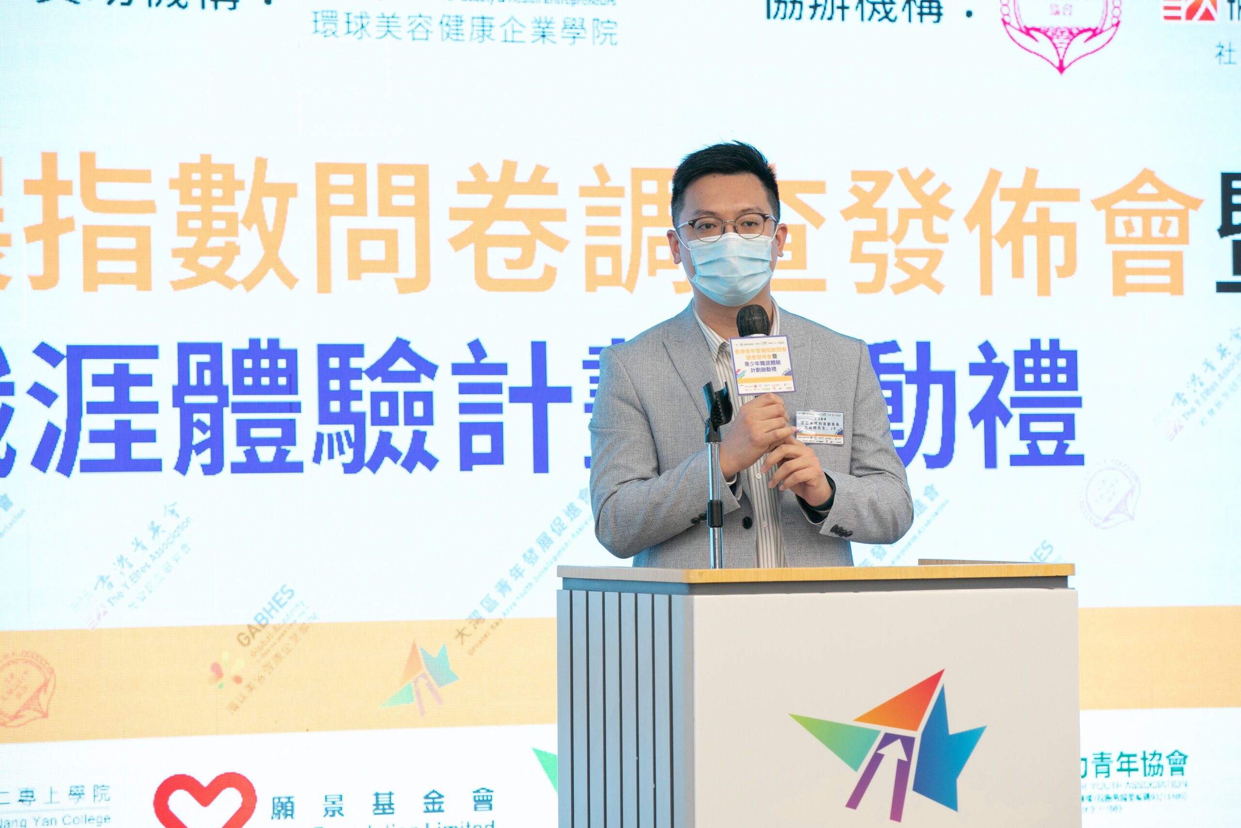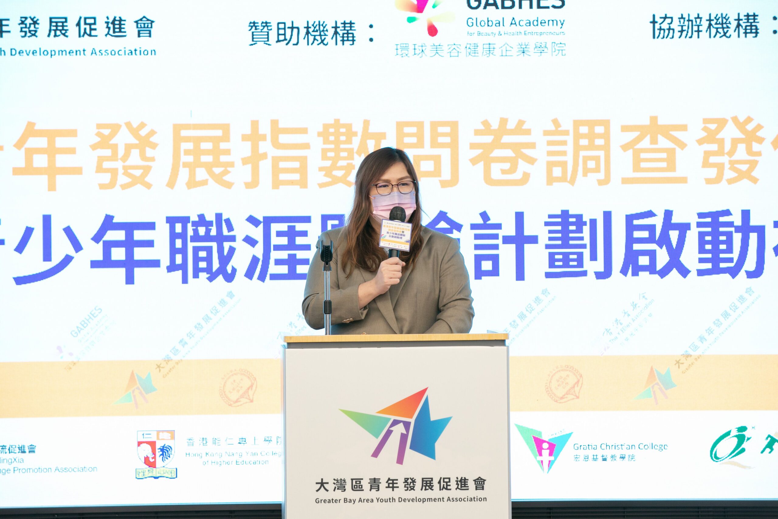 (中華時報/中華新聞通訊社香港訊)大灣區青年發展促進會於2021年10月30日假香港九龍達之路78號生產力大樓4樓舉行「香港青年發展指數」- 問卷調查暨青年職涯體驗計劃啟動禮。活動當日中央人民政府駐香港特別行政區聯絡辦公室青年工作部巡視員張國來先生,勞工及福利局副局長何啟明先生, JP作為主禮嘉賓,另外亦邀請了大灣區青年發展促進會主席譚麗時小姐,香港化粧品同業協會監事長何紹忠先生,環球美容健康企業學院董事梁美英小姐,香港理工大學專業進修學院持續教育高級顧問鄒兆鵬博士,香港能仁專上學院署理校長汪國成教授以及粵港澳大灣區文創科技聯盟執行主席李嘉俊先生作為問卷調查分享嘉賓。同場亦有舉行美容生意創業及職業展覽以鼓勵青年人了解有關職業能力,活動吸引二百人到場參觀。