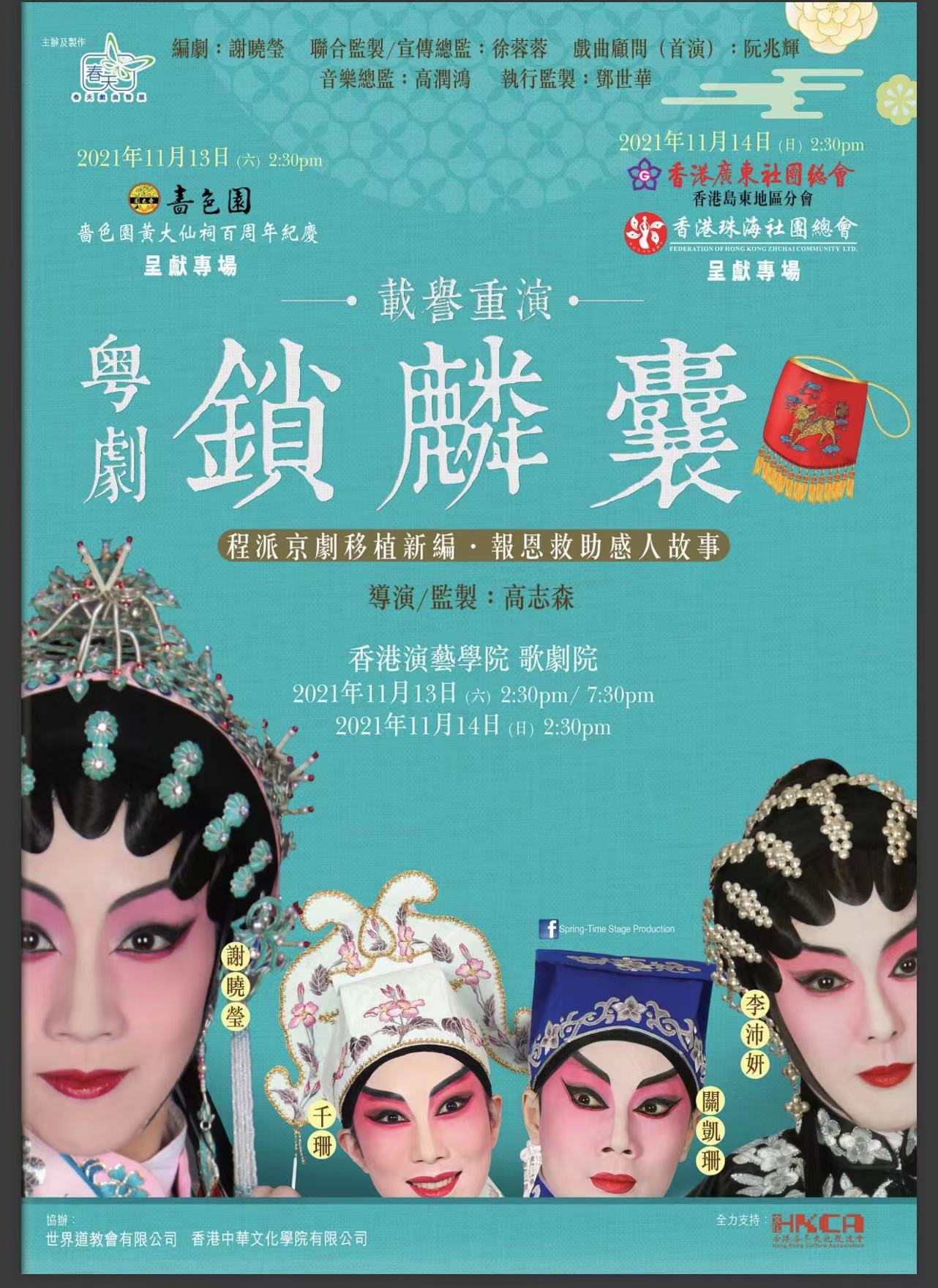 (中華新聞通訊社/中華時報訊)因為被京劇(程硯秋主演) 《鎖麟囊》深深吸引,導演高志森決定首次製作粵劇《鎖麟囊》,邀請謝曉瑩編劇,高潤鴻音樂設計,謝曉瑩、李沛妍、千珊及關凱珊主演此劇於2021年7月10及11日於香港西九戲曲中心大劇院首演,演後大獲好評。不少人均希望此劇重演。得到鼓勵及贊助,加上香港演藝學院有空檔期,高志森毅然決定於2021年11月13日14日假香港演藝學院重演三場。